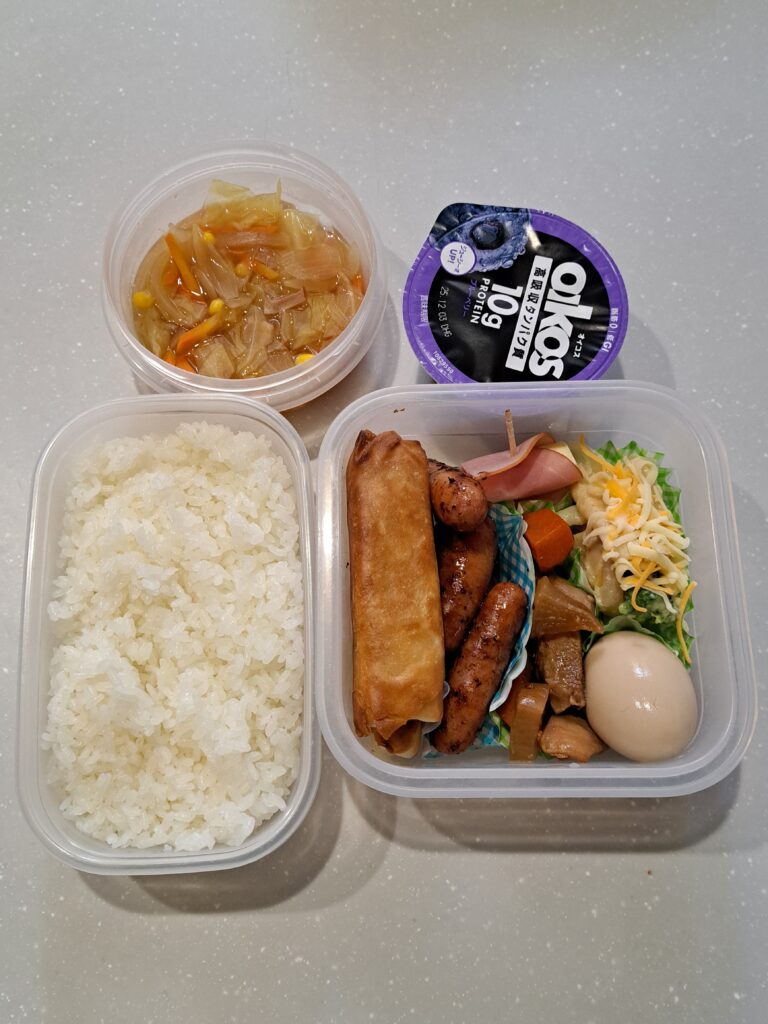 下段:お米・おかず(はるまき・ウィンナー・煮卵・煮物・ハムチーズ串・グラタン)