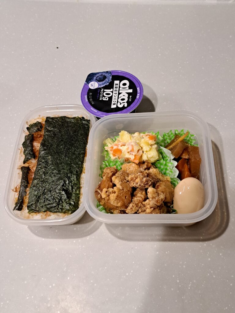 パパ弁当4 お弁当 2025.12.26 いつぞやのパパ弁当🍱 ・海苔弁 ・唐揚げ 煮卵 煮物 ポテトサラダ ・オイコスヨーグルト 白米ばかりだと飽きるから、ご飯に鰹節かけて醤油少したらして海苔のせてみました! 唐揚げは前日の夕飯の残りです🍚 5枚揚げたのにお弁当に入れて、夕飯に食べたらなくなりました💦 今回の重量は989g✨ あと少しで1000gだったのにー!!!! なんかちょっと悔しい😫笑 次は1000g目指して頑張ろー💪笑