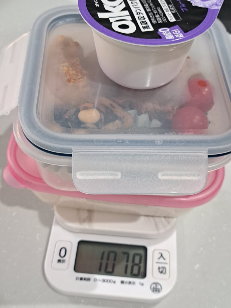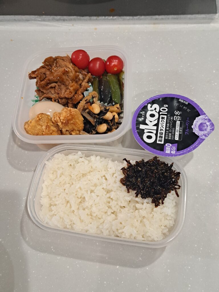 パパ弁当7 Uncategorized 2026.03.19 今回のお弁当は ・豚焼肉・煮卵(作り置き)・唐揚げ(冷凍)・ひじき煮(作り置き)・なすとピーマンのピリ辛揚げびたし(作り置き)・トマト・白米の上はシソヒジキ・オイコスヨーグルト 重量は 1078g 減らしてと言われてたけど、結局この量を食べてます🤭 今日も一日頑張ってもらいます✨