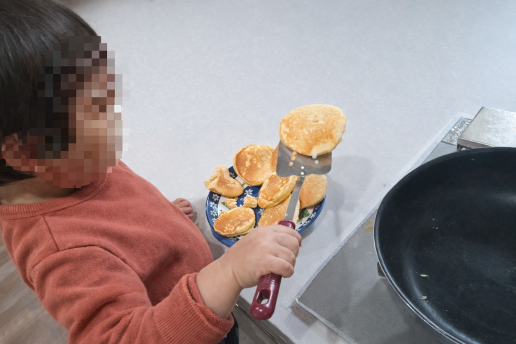2人でいると、公園に行くか図書館に行くことが多いのですが、時々一緒にホットケーキを作ります🥞